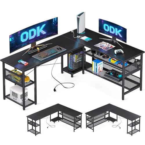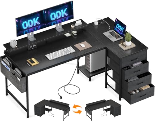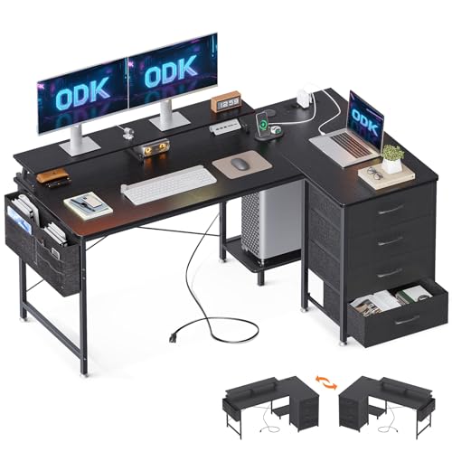 ODK hörnskrivbord med lådor, L-format skrivbord med uttag och USB-portar, spelbord med vändbar förvaring för hemmakontor, svart, 155×110 cm