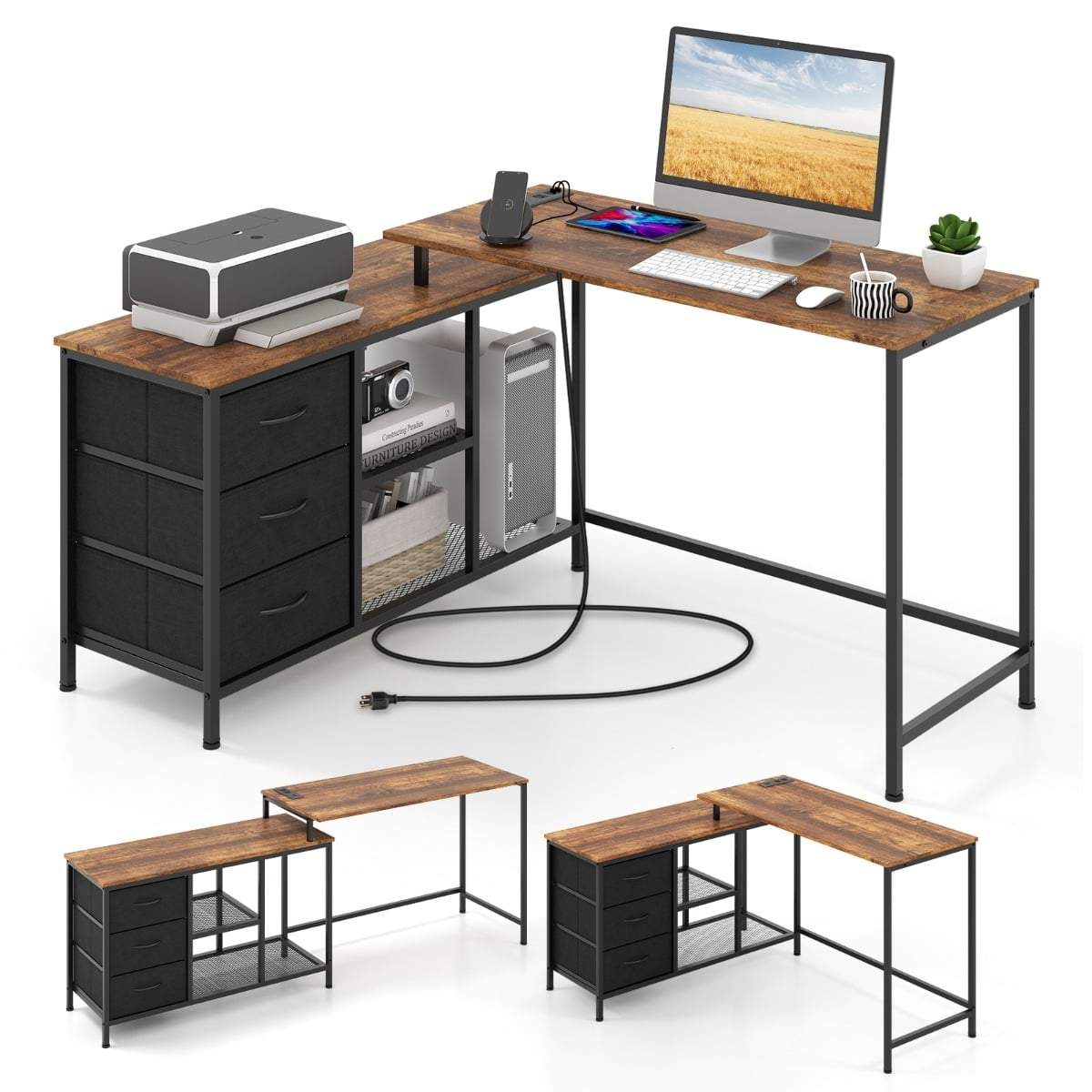 COSTWAY L-format skrivbord med uttag, vändbart hörnskrivbord med 3 tyglådor och gallerhyllor, 205 cm långt datorbord, hörnbord för hemmakontor (rustik brun)