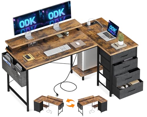 ODK Hörnskrivbord med Lådor, L-format Skrivbord med Uttag & USB-laddningsport, Reversibelt Hörnskrivbord med Förvaring för Hemmakontor (Brun, 135x100cm)