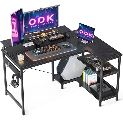 ODK 120 × 70 cm L-format Gaming Bord med LED-Lampor och Eluttag, Skrivbord med Förvaringshylla, Hörndatorbord med Monitorstativ, Datorskrivbord för Gaming Kolfiber Svart