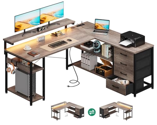 ODK Skrivbord med Lådor, Reversibelt Hörnskrivbord med 2 Vägguttag & 2 USB-portar, L-format Kontorsbord med LED för Hemmakontor (Grå ek, 155x110cm)