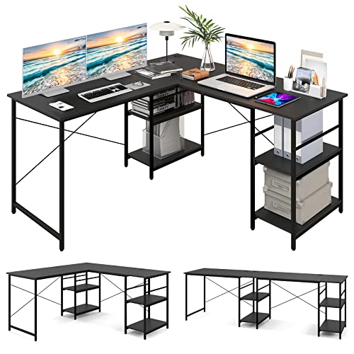 GIANTEX L-format hörnskrivbord, konvertibelt datorbord med 4 hyllor och 3 kabelhål, 2 personers skrivbord för hemmakontor (svart)
