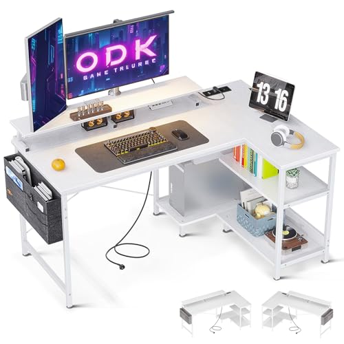 ODK L-format skrivbord, hörnskrivbord vitt med USB-laddningsport och uttag, spelbord L-form med hylla vändbart, L-format datorbord med monitorstativ för kontor