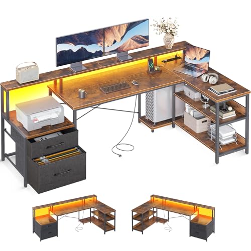 ODK Skrivbord med lådor, 189,3 × 100 cm, stort vändbart hörnskrivbord med 2 USB-laddningsportar och uttag, spelskrivbord med LED, L-format skrivbord för hem kontor, vintagebrun