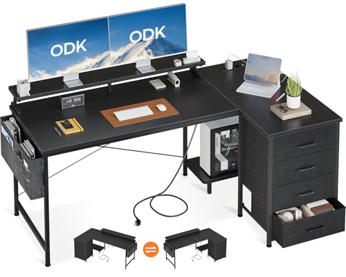 ODK skrivbord L-form med lådor, 160 x 80 cm hörnskrivbord reversibel med USB-laddningsport och uttag, L format skrivbord med monitorhållare för hemmakontor, svart