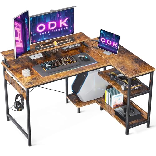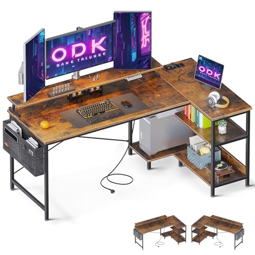 ODK skrivbord L-form, hörnskrivbord med USB-laddningsport och uttag, spelbord L-form med hylla reversibelt, L-format datorbord med monitorstativ för kontor (brun, 147 x 80 cm)