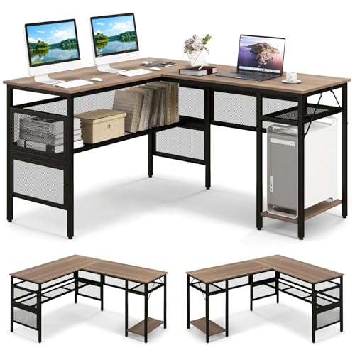 COSTWAY L-format skrivbord, reversibelt hörnskrivbord med gallerhyllor och CPU-stativ, hörnbord, datorbord, kontorsbord för hemmakontor, 140 x 120 x 74 cm