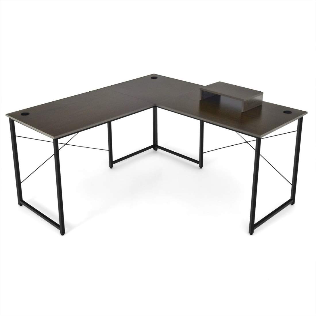 L-format skrivbord med monitorstativ & 3 kabelhål vändbart hörnskrivbord brunt