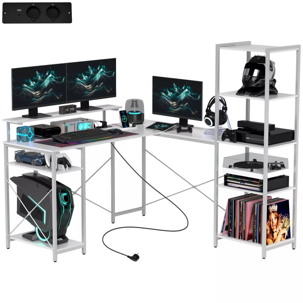 L-format skrivbord med laddstation, hörn datorbord med bildskärmsstativ och hyllor, för hemmakontor, kontor, vit