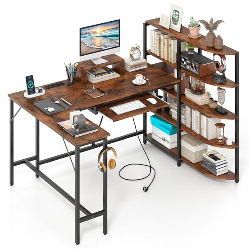 COSTWAY Skrivbord L-format med laddningsstation och bokhylla, hörnskrivbord med monitorstativ, krok och tangentbordshylla, datorbord med metallram, arbetsbord för hem och kontor (brun)