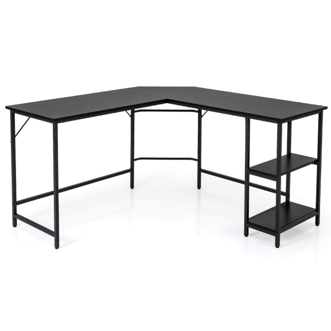 148 cm långt L-format datorbord med öppna hyllor, platsbesparande skrivbord för en modern arbetsplats, svart
