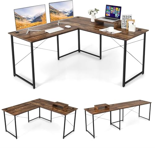 Costway L-format skrivbord, vändbart hörnskrivbord med ställ för datorskärm, hörnbord med 3 kabelhål, speldatorbord, kontorsbord för hemmakontor, 150 x 150 x 74 cm (rustikt brunt)