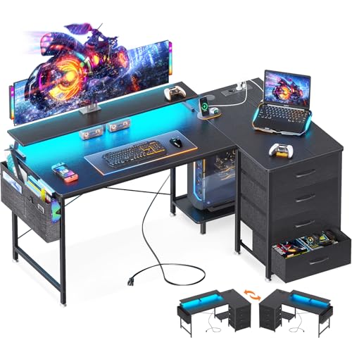ODK LED-hörnskrivbord, 140 x 80 x 84,7 cm L-format skrivbord med 4 vändbara lådor datorbord med 2 USB-laddningsuttag och 2 hemmauttag, svart