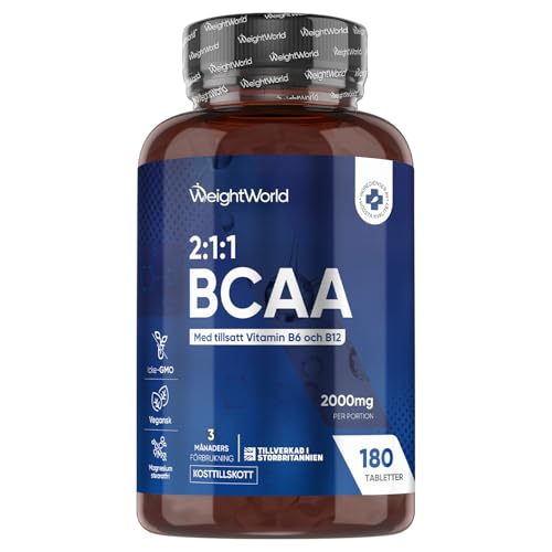 BCAA 2000 mg med vitamin B12 och B6 – 2:1:1 – L-leucin, L-isoleucin, L-valin – 180 tabletter – 3 månaders förbrukning – 2 tabletter dagligen – vegan, GMO-fri & fri från magnesiumstearat – WeightWorld
