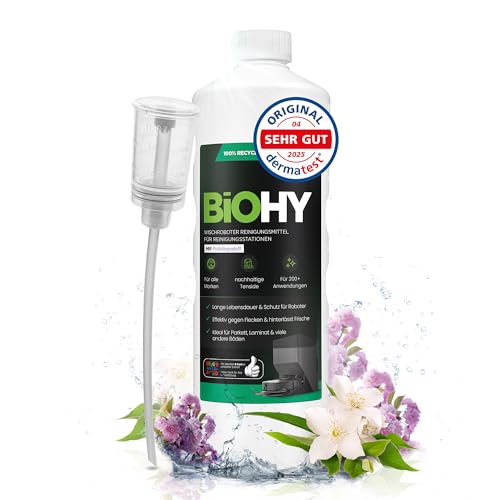 BiOHY Mopprobot rengöringsmedel med fräsch vårdoft (1l flaska) + doser | Särskilt utvecklad för rengöringsstationer | Förlänger livslängden för sugstationen (Wischroboter Station Frühling)