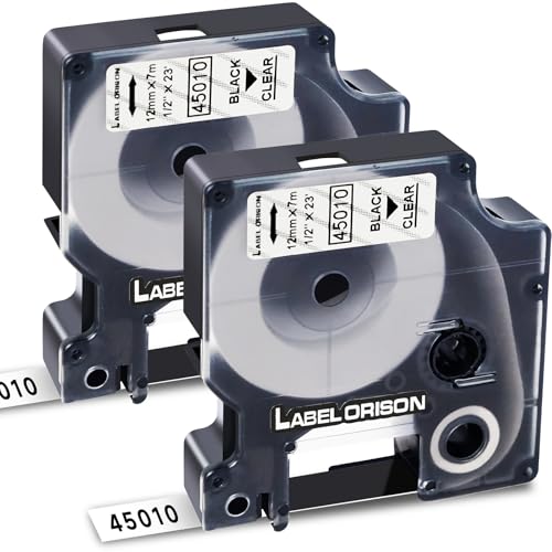 Label Orison 45010 12 mm, kompatibel med Dymo Label Maker, påfyllningsförpackningar för Dymo D1-etikettband, LabelManager 100 160 200 210D 280 500TS 420P 360D LabelWriter 450 Duo, svart på klar, 2X