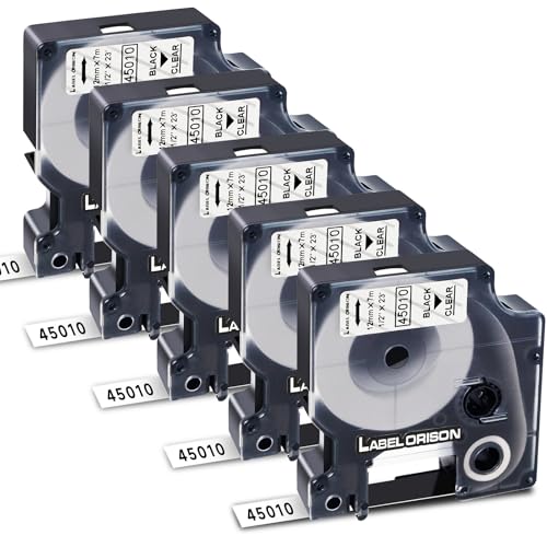 Label Orison Kompatibla märkband som ersättning för Dymo 45010 svart på transparent 12 mm x 7 m etikettband för Dymo LabelManager LM160 LM210D LM260P LM280 LM360D LM420P, 5-pack