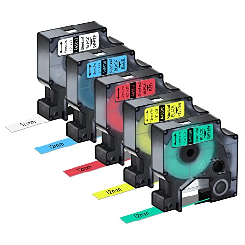 NineLeaf 5 x kompatibel med Dymo D1 tejp 12 mm x 7 m 45013 45016 45017 45018 45019 etikettband för LabelManager 160 280 100 210D 360D 420P 450D PnP, svart på vit/gul röd/grön/Blå