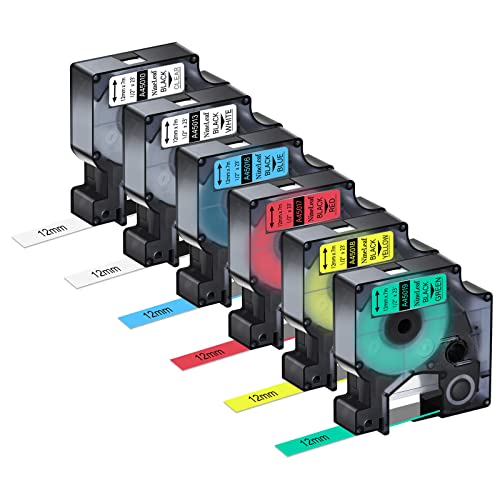 NineLeaf 6 x kompatibel med Dymo D1 12 mm etikettband 45013 45010 45016 45017 45018 45019 etikettband 12 mm x 7 m för LabelManager 160 280 100 210D 360D 420P, svart klar/vit/gul /röd/grön/blå