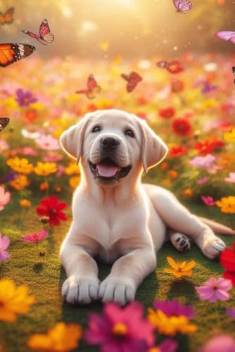 Labrador Retriever Puppy in a field of colorful flowers Notebook - Large 6 x 9 inches - 127 Pages