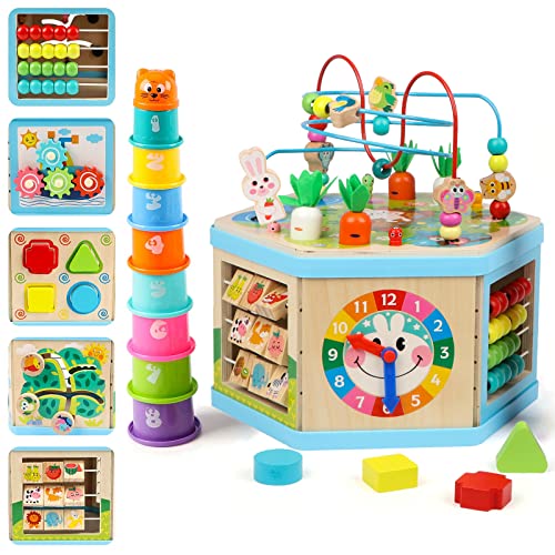Jacootoys Träaktivitetskub, 7-i-1 träaktivitetsbord, pedagogiskt centrum, pärlla labyrint, sortering av leksak för barn, barn, pojkar och flickor