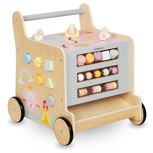 Mamabrum trärullator för barn, 2-i-1-skjutare, motorkub, leksak för tidig utbildning: åkbar, sorterare, labyrint, kulram, block med siffror, skjutreglage, halkfria hjul