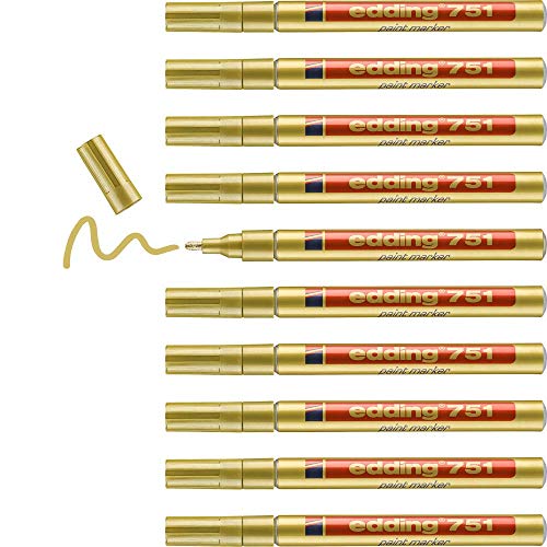 edding 751 lackmarkör – guld – 10 lackmarkörer – rund spets 1–2 mm – lackpenna för glas, sten, trä, plast och papper – vattentät, starkt täckande