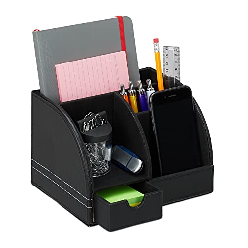 Relaxdays Skrivbordsorganisatör i konstläder, kontorsorganisatör med låda, 4 fack, pennhållare, 13 x 19 x 15 cm, svart