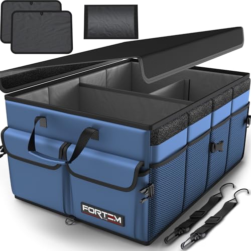 FORTEM Bagageutrymmeslåda, Bakluckelåda, Organisera Bagageutrymmet, Hopfällbar Låda med Flera Fack, Halkfri Undersida, Justerbara Säkra Spännen, Bagagelåda med Vikbart Lock (Blå, Extra Stor)