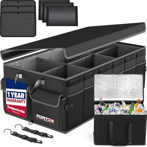 FORTEM Bagageutrymmeslåda, Bakluckelåda, Organisera Bagageutrymmet, Hopfällbar Låda med Flera Fack, Halkfri Undersida, Justerbara Säkra Spännen Bagagelåda med Vikbart Lock (Extra Stor Med Kylare)