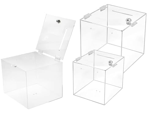 TUKA-i-AKUT Set med 3 donationslådor 30 cm + 25 cm + 20 cm, med lås, akryl reklamlåda, lotteri låda, aktielåda, valurna, transparent akryl TKD8260-set
