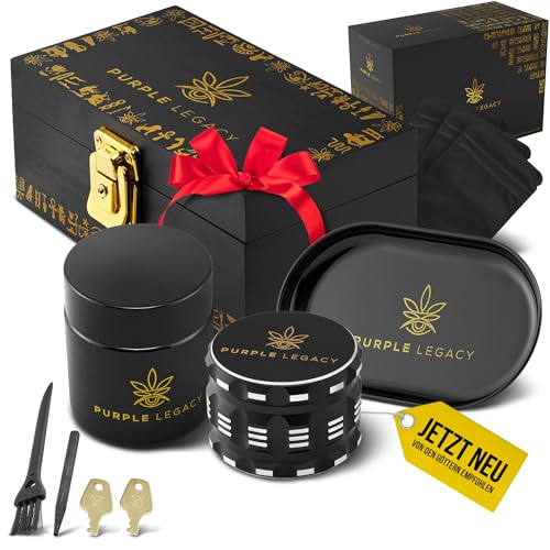 PURPLE LEGACY® Designad i Tyskland | Presentset, kvarnlåda, låsbar låda av bambu | Förvaringsbox med kross, bricka, UV-glas och tillbehör, förvaringslåda med lås, kvarn stor