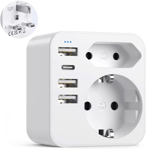 6 i 1 Adapter European Plug till UK med 3 USB+1 Typ C+ 2 Schuko Spanien,England Plug Adapter för Irland Engelska Skottland British Maldiverna (G-typ)