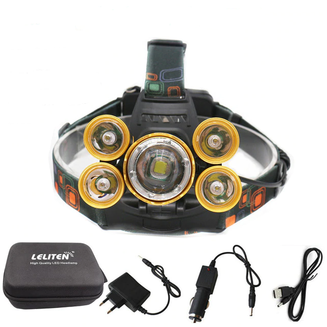 Laddningsbar LED Pannlampa för Löpning & Orientering, 5 Lampor, IPX4, Zoom, Batterier