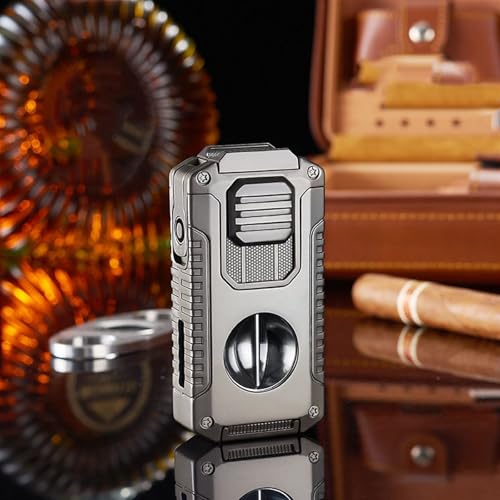 Multifunktionell tändare, cigarrtändare, justerbar flamstorlek, laddningsbar butantändare, bärbar metalltändare, vindtät trippeltändare for cigarrer, lägereld, present for män(D)