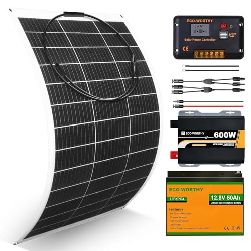 ECO-WORTHY 130 W 12 V flexibel solmodul komplett uppsättning: 130 W flexibel solpanel + 50 Ah litiumbatteri + 600 W 12 V sinusväxelriktare + 30 A PWM-laddningsregulator för husvagn