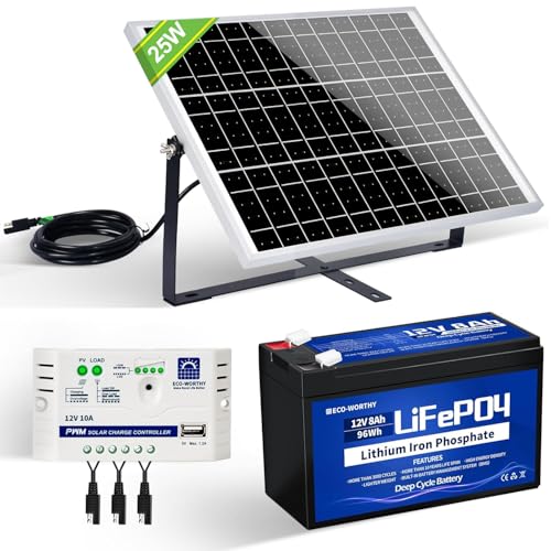 ECO-WORTHY 25W 12V off-grid Solpanelsats med Litiumbatteri: 25W Solmodul + Batteriklämma Kabel + 10A Laddningsregulator + 8ah LiFePO4 Batteri för Hönshus Mobiltelefon bil Husbil Camping Utomhus