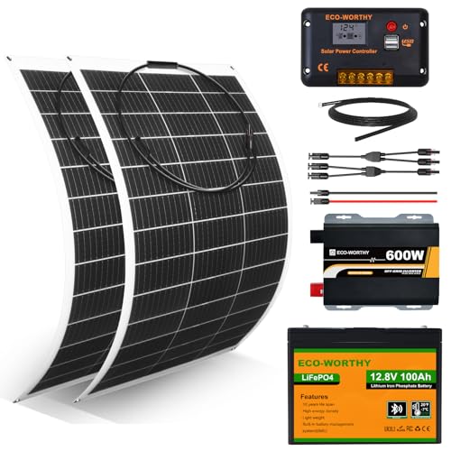 ECO-WORTHY 260 W 12 V flexibel solpanel komplett kit: 2 x 130 W flexibel solmodul 100 Ah lithiumbatteri 600 W 12 V sinusvågsomvandlare 30 A PWM laddningsregulator för campare, husbil, skåpbil