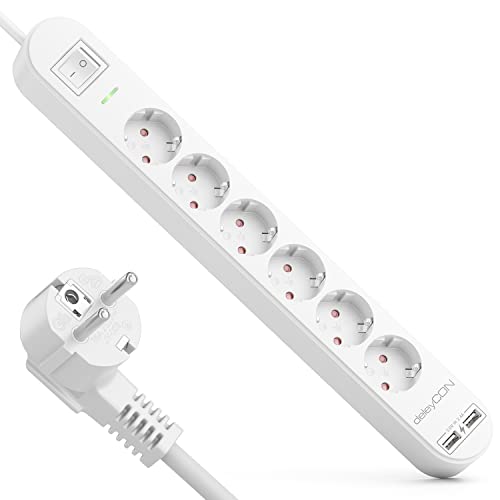 deleyCON 1,5m 6-Vägs Grenuttag med USB Strömlist, 6x Skyddskontaktuttag, 2x USB-A Ladduttag för t.ex. Mobil & Surfplatta, Överspänningsskydd, AV/PÅ-Knapp, Vit