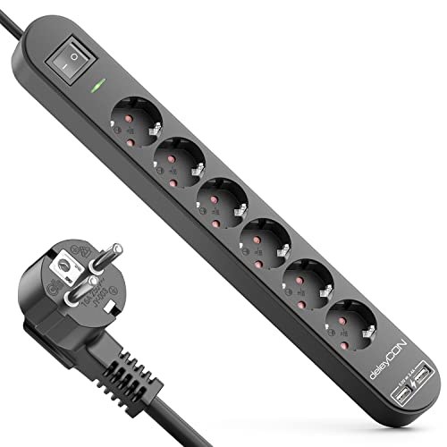 deleyCON 1,5m 6-Vägs Grenuttag med USB Strömlist, 6x Skyddskontaktuttag, 2x USB-A Ladduttag för t.ex. Mobil & Surfplatta, Överspänningsskydd, AV/PÅ-Knapp, Svart