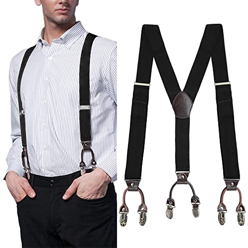 Herrhängslen med starka 6 metallklämmor, hängslen för män byxor tunga 35 mm breda hängslen elastiska korsstag justerbar Y-rygg äkta läder trimmade knapp, Svart, en storlek