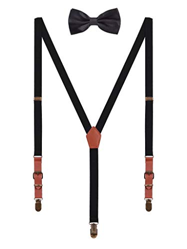 WANYING män 2 cm hängslen fluga set – PU-läder 3 retro mässingsliknande klämmor Y-form hängslen elastiska justerbara för längd 140–190 cm, Svart med fluga, 2,0*115cm (für Körpergröße 140-190cm)