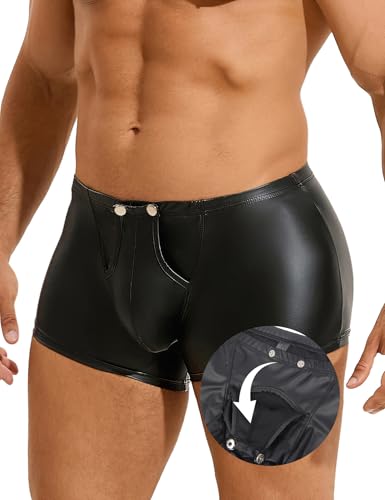 Sexiga boxershorts för män med öppning, PU-läder, underkläder med påse, stora storlekar, wetlook, kalsonger med knappar, Sissy underkläder för män, sexiga underkläder, erotiska shorts, trosor