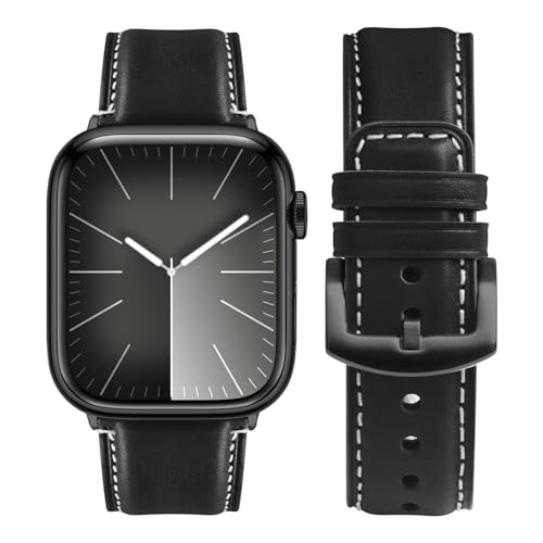 Wristitani Läderarmband kompatibelt med Apple Watch 49 mm 46 mm 45 mm 44 mm 42 mm, äkta läder hållbar metallkontakt, för iWatch Ultra Series 10 9 8 7 SE 6 5 4 3, Svart + svart hårdvara, 44/45/46/49