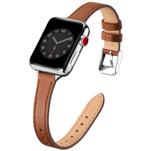 Läderarmband kompatibelt med Apple Watch-armband 42 mm (serie 11 10) 41 mm 40 mm 38 mm, dam tunt ersättningsband, smala armband för iwatch serie 11/10/9/8/7/6/5/4/3/2/1, SE 1–3 (brun och silver)