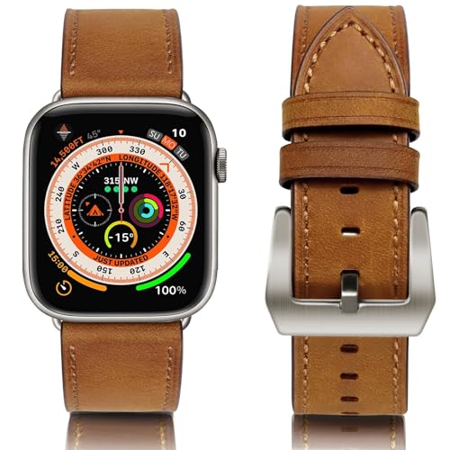 Oielai Läderarmband kompatibelt med Apple Watch armband 45 mm 44 mm 42 mm 49 mm, mjukt äkta läderarmband för Apple Watch SE/iWatch Series Ultra 9 8 7 6 5 4 3 2 1 för män och kvinnor, ljusbrun