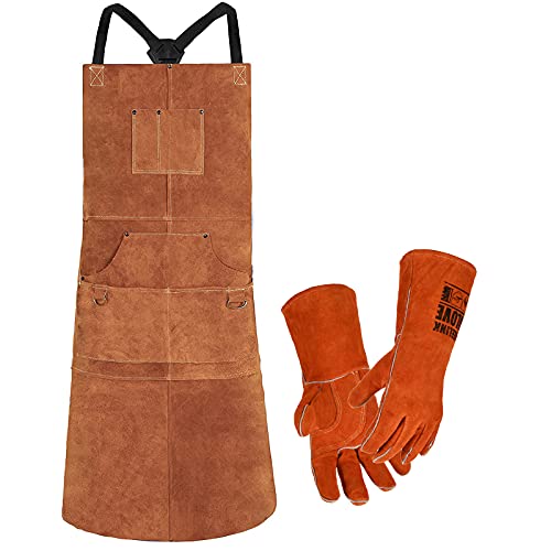 QeeLink Träarbetsförkläde i läder, läderförkläde med 6 verktygsfickor slitstarkt svetsförkläde för män kvinnor värmebeständigt arbete butikstillbehör, justerbart M till XXL, Brun 61 cm x 91 cm med