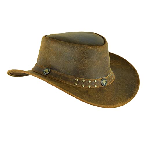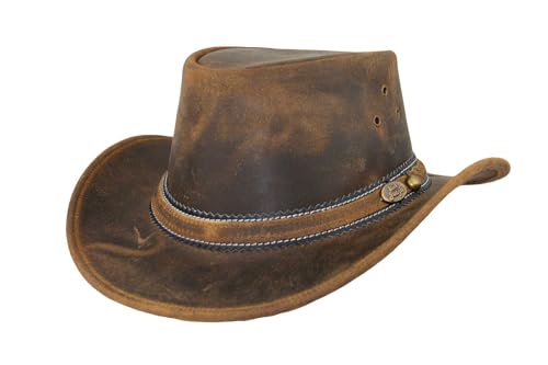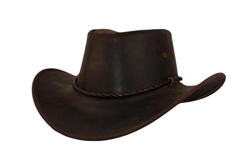Leatherick Cowboyhatt - Brun dubbad och flätad Crazy Horse-läderhatt i västra australiensisk stil med hakrem (XL, brun med dubb)