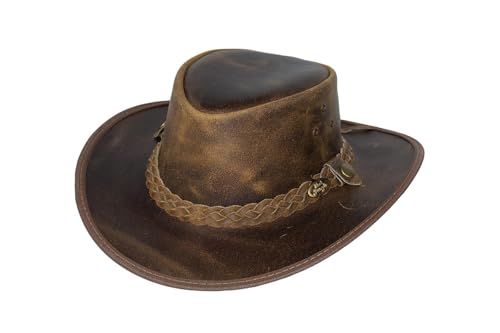 Leatherick Cowboyhatt - Brun dubbad och flätad Crazy Horse-läderhatt i västra australiensisk stil med hakrem (XL, brun med fläta)