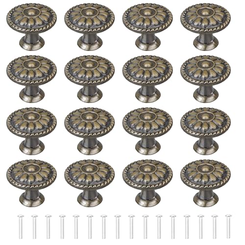 YEYIT Antikbronsfärgade dörrknoppar, 16 st runda lådknoppar, skåphandtag med ett hål, svampformade lådhandtag, 30 mm, aluminiumlegering och blommönster, knoppar med skruvar för lådor